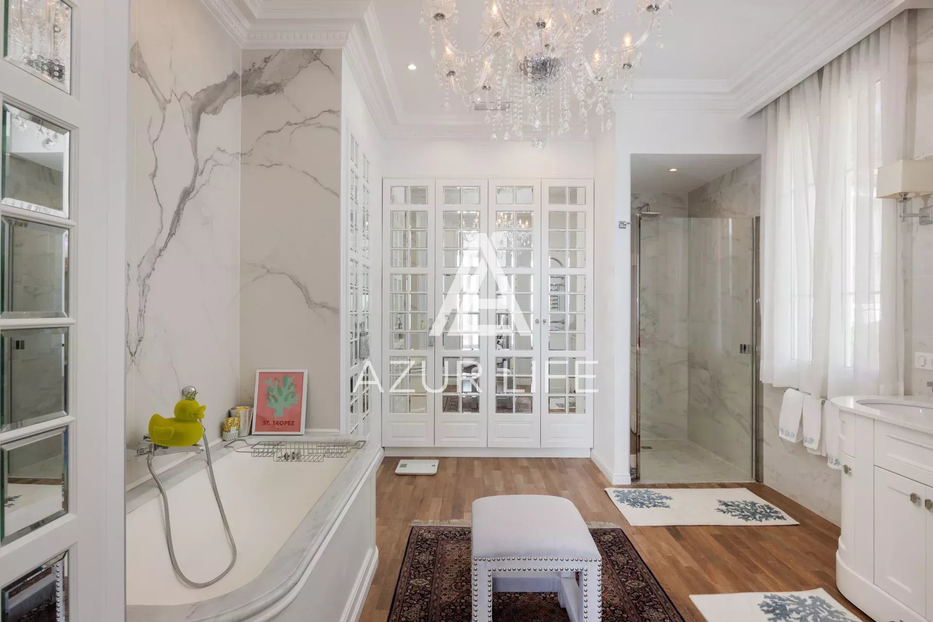 D’une surface d’environ 200 m², la villa principale se compose d’une entrée, d’un double salon, d’une salle à manger et d’une cuisine séparée entièrement équipée. Une chambre et une salle de bain complètent le niveau du rez-de-jardin.